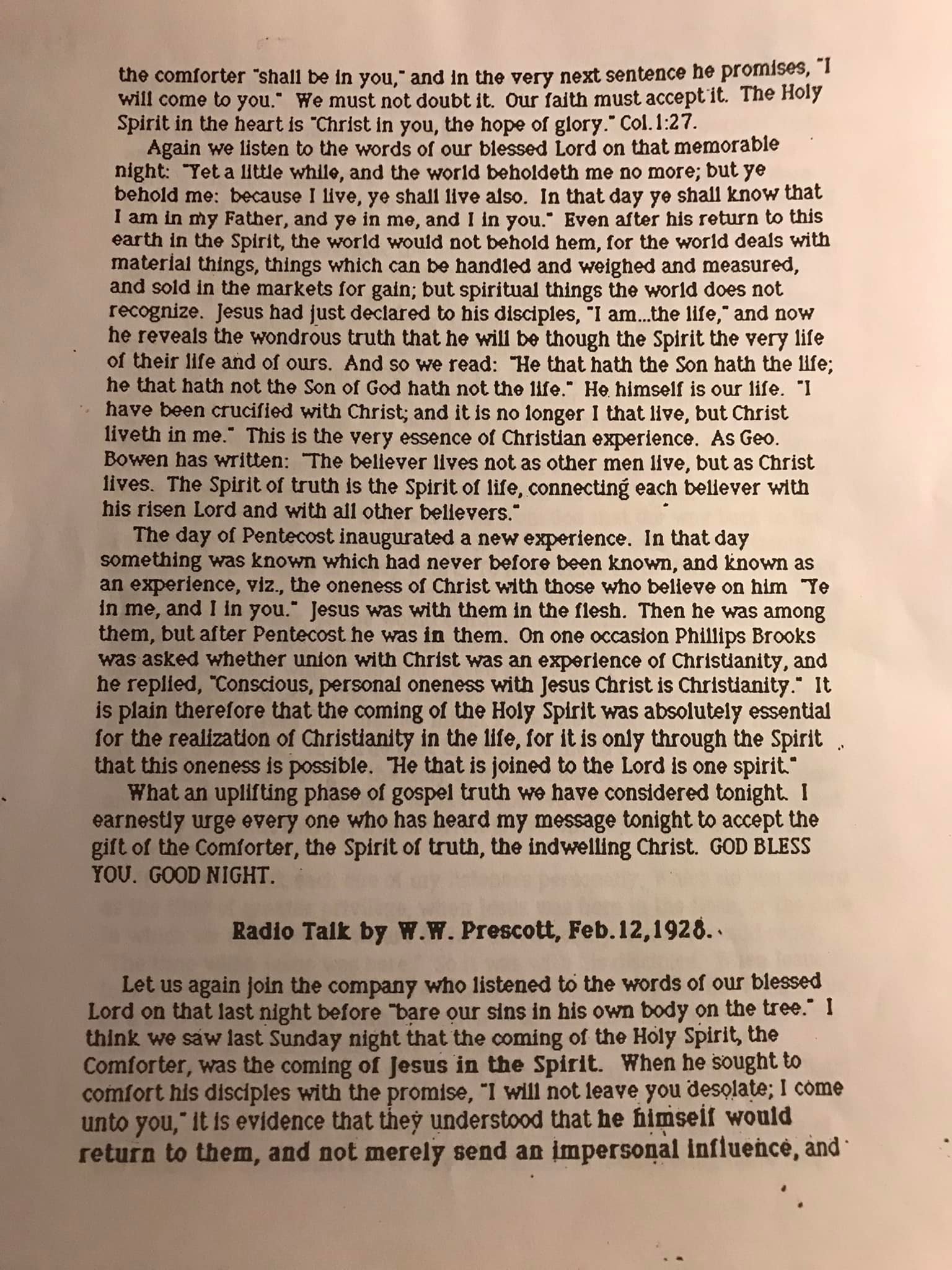 Below are the photo copies of what appears to be a series of transcripts by W. W. Prescott, which he used on a radio talk show, dated Jan 29, 1928 to February 19, 1928. In the articles, Prescott explains in detail who the “Third Person of the Godhead” is.