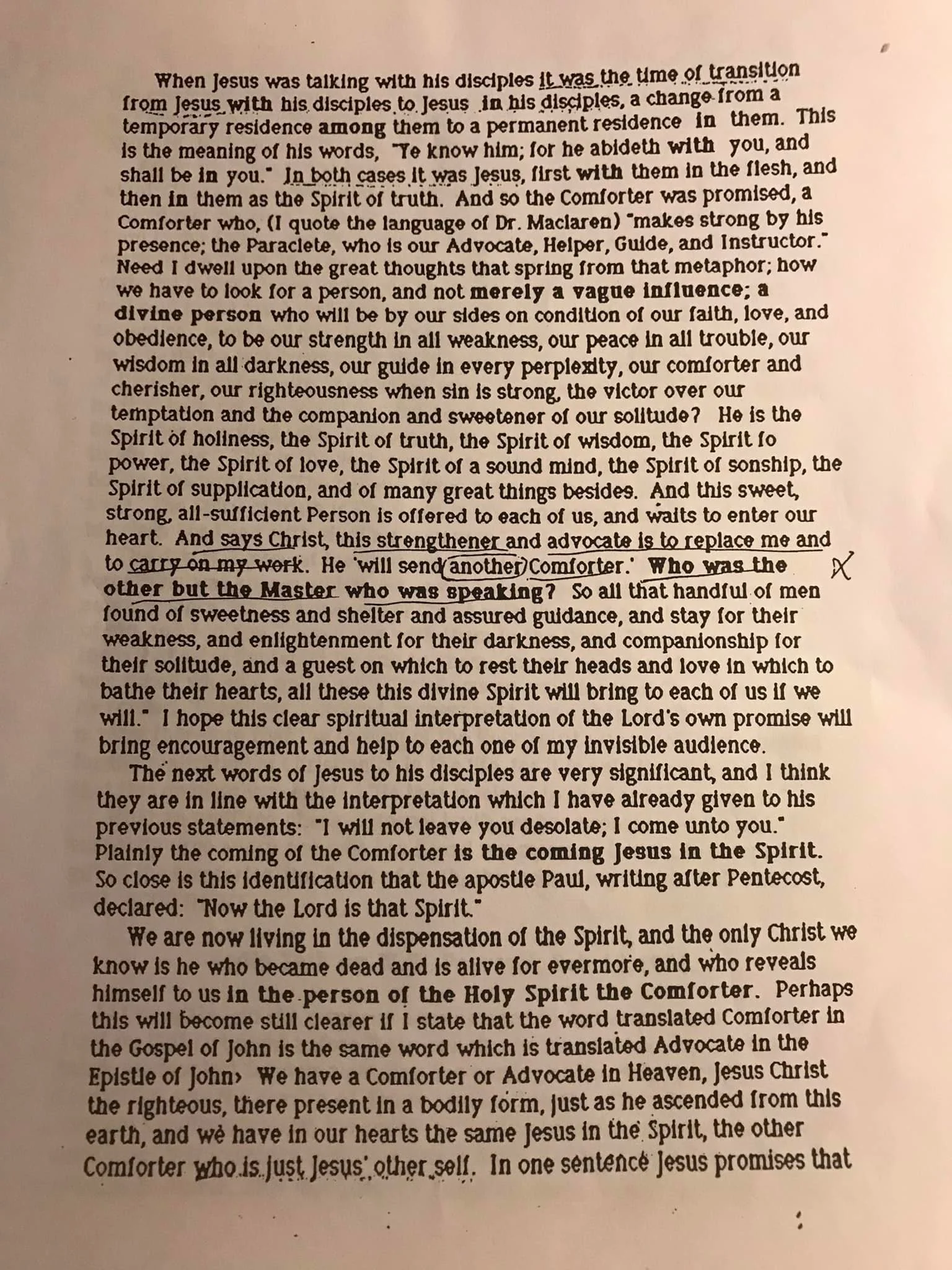 Note the new word here met with for the first time, “Comforter.” NO NEW AGENT IS HERE DESIGNATED. We have read of the Spirit from the first chapter of Genesis, but now in the historical development of the gospel of our salvation, the Spirit enters upon a new mission, introducing a new dispensation, and it is fitting that a NEW TITLE SHOULD BE APPLIED. When the Son of God assumed our human nature and took up His residence in a new way upon earth in order that He might accomplish the work assigned to Him in providing salvation for us, He did not cease to be God, but at the same time applied to Himself a NEW DESIGNATION-THE SON OF MAN. HE WAS THE SAME PERSON, AND YET DIFFERENT. So when the Spirit of God, in succession to the God-man , took up His residence upon earth in a new way in order that He might accomplish the work assigned to Him in providing salvation for us, IT WAS FITTING THAT THIS NEW RELATIONSHIP SHOULD BE RECOGNIZED BY A NEW TITLE-THE COMFORTER. {1929 WWP, SOTW 72.3}