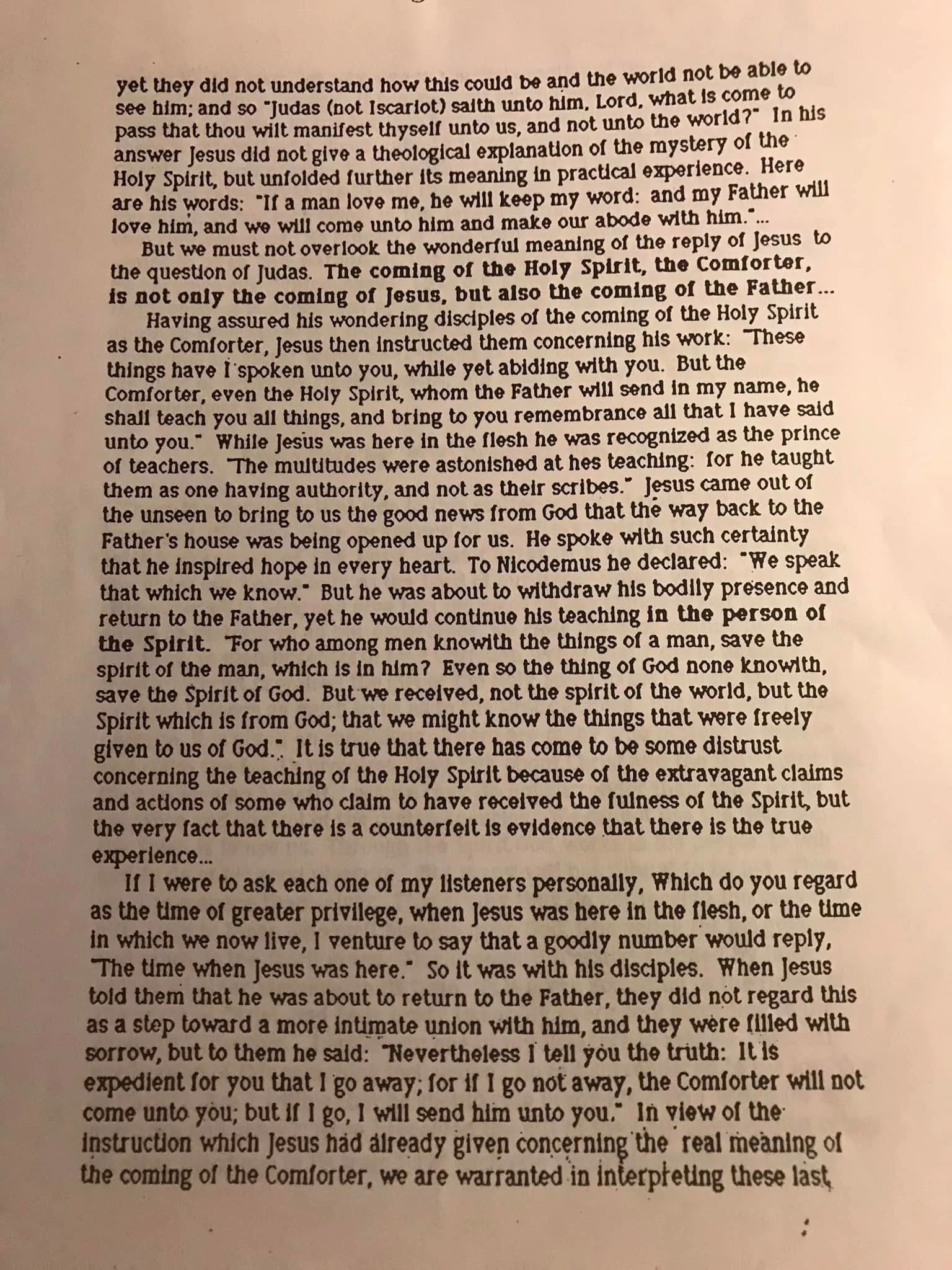 Jesus continued; “He that loveth Me shall be loved of My Father, and I will love him, and will manifest Myself unto him.” John 14:21. THE EVIDENT IMPRESSION CREATED IN THE MINDS OF HIS LISTENERS WAS THAT HE HIMSELF, AND NOT AN INFLUENCE EMANATING FROM HIM, WAS TO BE REVEALED TO THEM, AND THEY FAILED TO UNDERSTAND HOW SUCH A PRIVILEGE COULD BE GRANTED TO THEM AND THE WORLD NOT SHARE IN IT. This led to the question of Judas: “Lord, what is come to pass that Thou wilt manifest Thyself unto us, and not unto the world?” John 14:22. This inquiry led to a further unfolding of the blessing involved in the coming of the Comforter: “If a man love Me, he will keep My word: and My Father will love Him, and we will come unto him, and make our abode with him.” John 14:23. THE PRESENCE OF BOTH THE FATHER AND THE SON IS VOUCHSAFED TO US THROUGH THE INDWELLING SPIRIT IN THE COMING OF THE COMFORTER. What greater blessing, what greater privilege, could be desired? {1929 WWP, SOTW 76.1}
